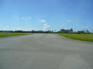 石垣空港には誘導路がないため、滑走路端まで進み、そこで180度ターンし離陸体制をとります。 |