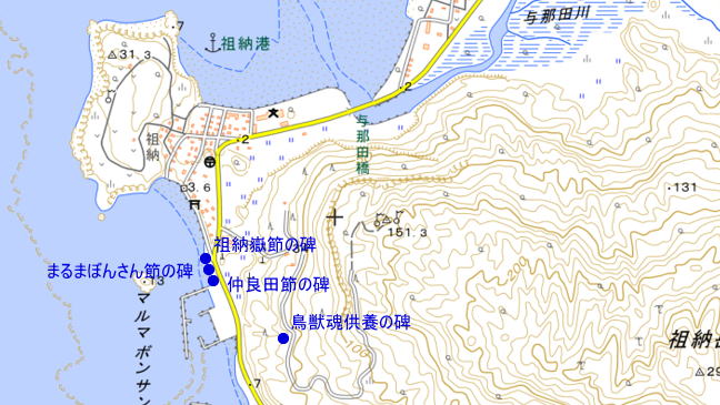 この碑がある場所は、船浮集落の資料館「西表館」所有者の池田さん宅の庭です。 (現在、碑は元の場所から海側に移されています。)