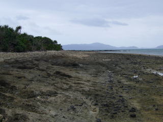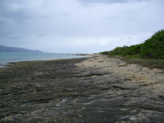 | 島の東側の海岸で向いは石垣島です。足元は炭酸カルシウムのセメント作用により、海浜堆積物が岩のように一つに固まったビーチロックがあります。 |