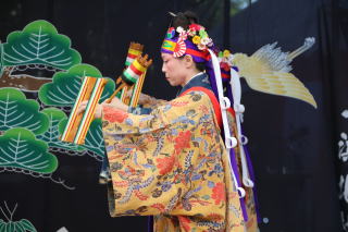 踊り手の衣装は、300年以上前のものと伝えられる紅型だそうです。多少の擦れ等はありますが美しい紅型です。