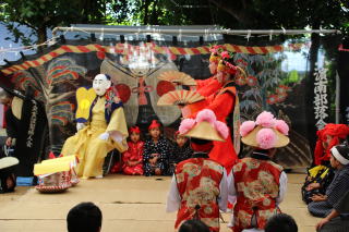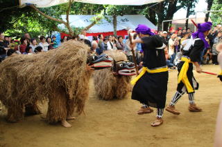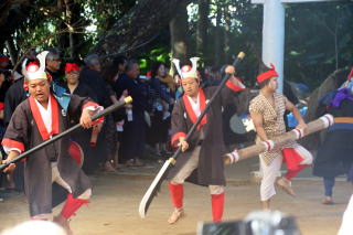 結願祭の開催日程は、例年、旧暦8月の己亥(つちのとゐ)の日から、庚子(かのえね)、辛丑(かのとうし)の連続する3日間が多いようです。結願祭は、初日を「スクミ(仕込み)」、2日目を「ショウニツ(正日)」、3日目を」「トゥンドミ(締めくくり)」と言い、スクミで奉納芸能の総稽古(リハーサル)が行われ、ショウニツで伝統芸能の神前奉納が行われます。