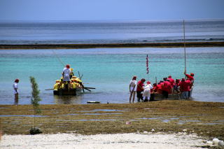 午前のパーレー競漕は、宮里村と仲本村の間で行われます。まずは、船を選ぶかコースを選ぶかの下見を行います。 |