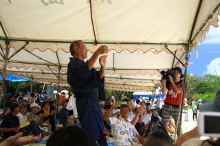 川満竹富町長の挨拶(祝辞)です。この後八重山農林水産振興センター所長の祝辞と、石垣在黒島郷友会会長の音頭による乾杯が行なわれました。 |