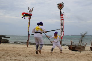 ウーニーの2人が「杯取らし」から訓示を受け、その後、杯を受けます。今年も「杯取らし」役は黒島ビジターセンターの宮良哲行さん(通称:テッちゃん)です。 |