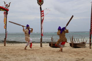 例年、黒島豊年祭では、午前と午後の2回に分けパーレー競漕が行われます。船漕ぎだけで勝ち負けが決まるのではなく、海岸到着後、ウーニーが陸上を走り、長老のもとに先に到着したほうが勝ちとなります。 |