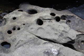 岩の窪みに入った小石が長い間水流によって転がり、岩を丸く削ってできたポットホール