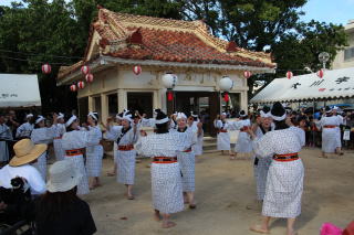 今回見学した大川地区の豊年祭(オンプール)は、16時から海星幼稚園横の大石垣御嶽にて開催され、人びとは今年の稔りに感謝し、来夏世(クナツユ)の五穀豊穣を祈願しました。旗頭奉納は勿論のこと、地域に伝わる各種の芸能を奉納したほか、優秀な成績を上げた農家を表彰し、最後は、獅子舞、ツナヌミン、大綱引きで終了しました。 |