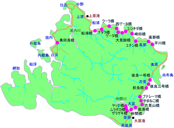 ここでは、個性的で特徴ある、西表島の橋の「親柱」を、東部地区から西部地区まで順に紹介します。