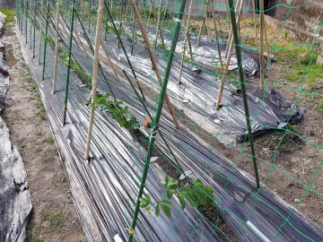 | 耕起・施肥した後、マルチ張り・ネット張りをして植付け。 2020.04.18 |