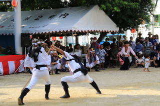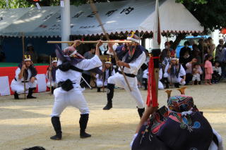 | 塩を撒いて境内が清められた後、棒術保存会による棒術奉納が始まります。 |